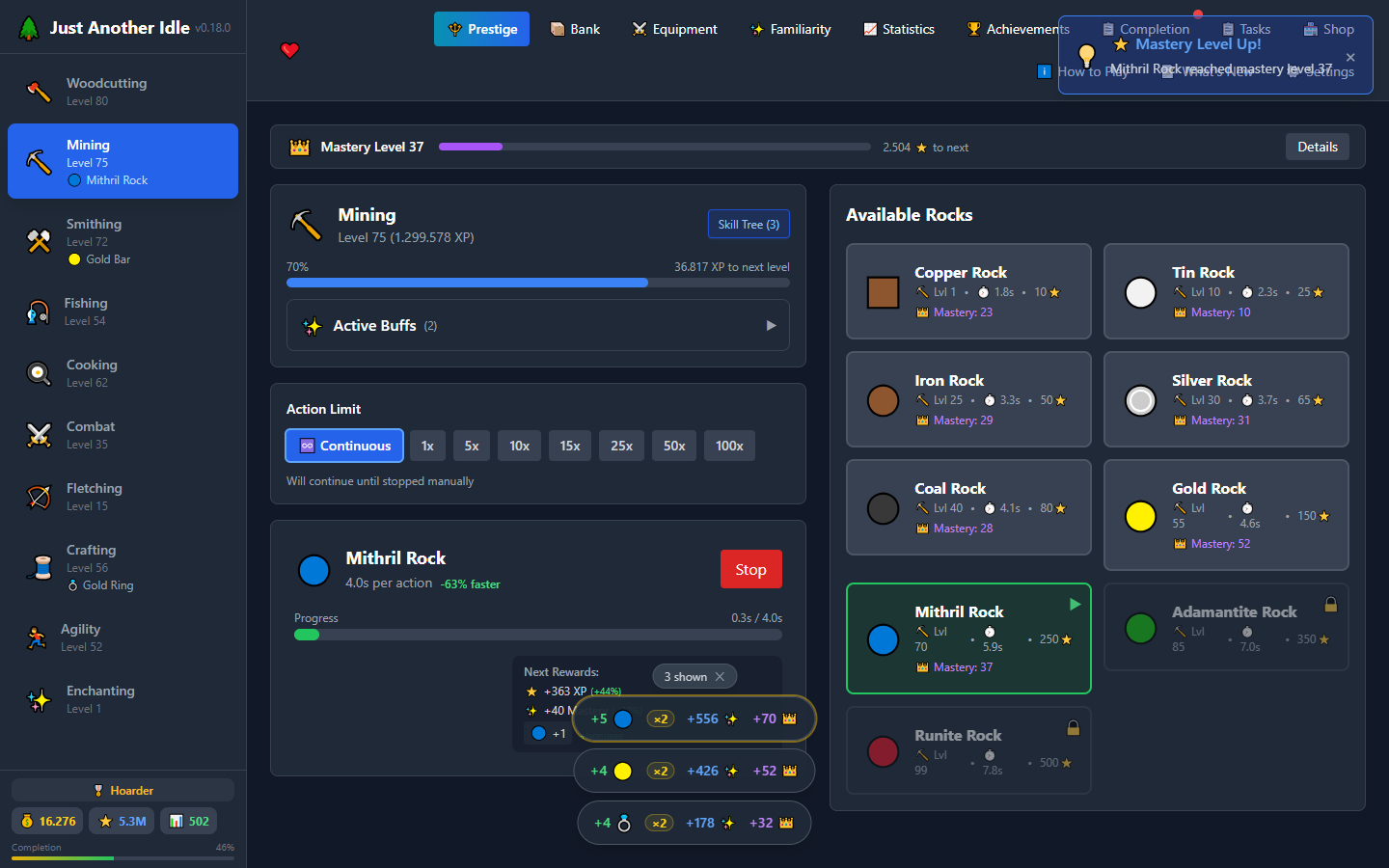 Prestige individual skills past 99 to unlock 100-120 content, passive milestones, and permanent multipliers. Each prestige makes you stronger.
