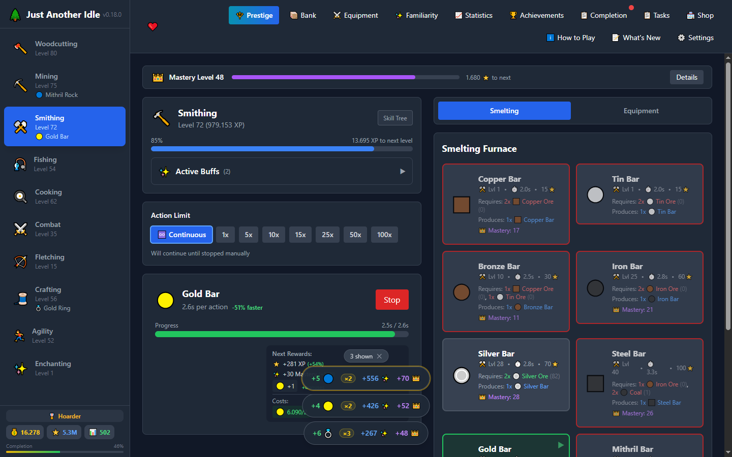 Prestige skills past level 99 to unlock levels 100-120, passive milestones, and permanent bonuses. No full game reset — evolve one skill at a time.